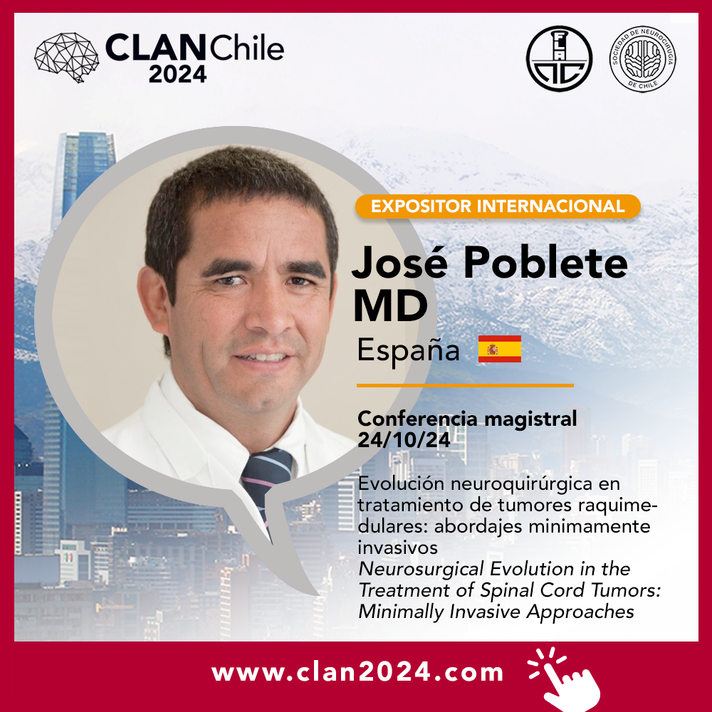 | 12:55-13:15 | Evolución neuroquirúrgica en tratamiento de tumores raquimedulares: abordajes minimamente invasivos Neurosurgical Evolution in the Treatment of Spinal Cord Tumors: Minimally Invasive Approaches | José Poblete España |