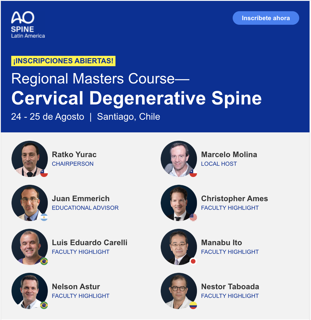 En su sexta edición, nuestro Curso Regional se llevará a cabo en Santiago en los días 24 y 25 de agosto. Únase a cirujanos de columna de toda la región en una oportunidad única para ampliar sus conocimientos sobre los últimos avances en cirugía de columna cervical con enfoque orientado a nuevas tecnologías y balance sagital. Analizaremos en profundidad las diferentes técnicas de cirugía de columna cervical avanzada, principalmente en la resolución de patologia degenerativa, inflamatoria y otras.