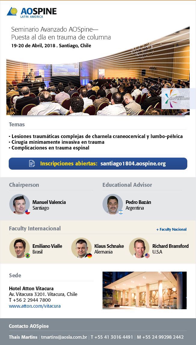 | Contacto: | Fono: +55 41 30164491 – tmartins@aosla.com.br – santiago1804.aospine.org |