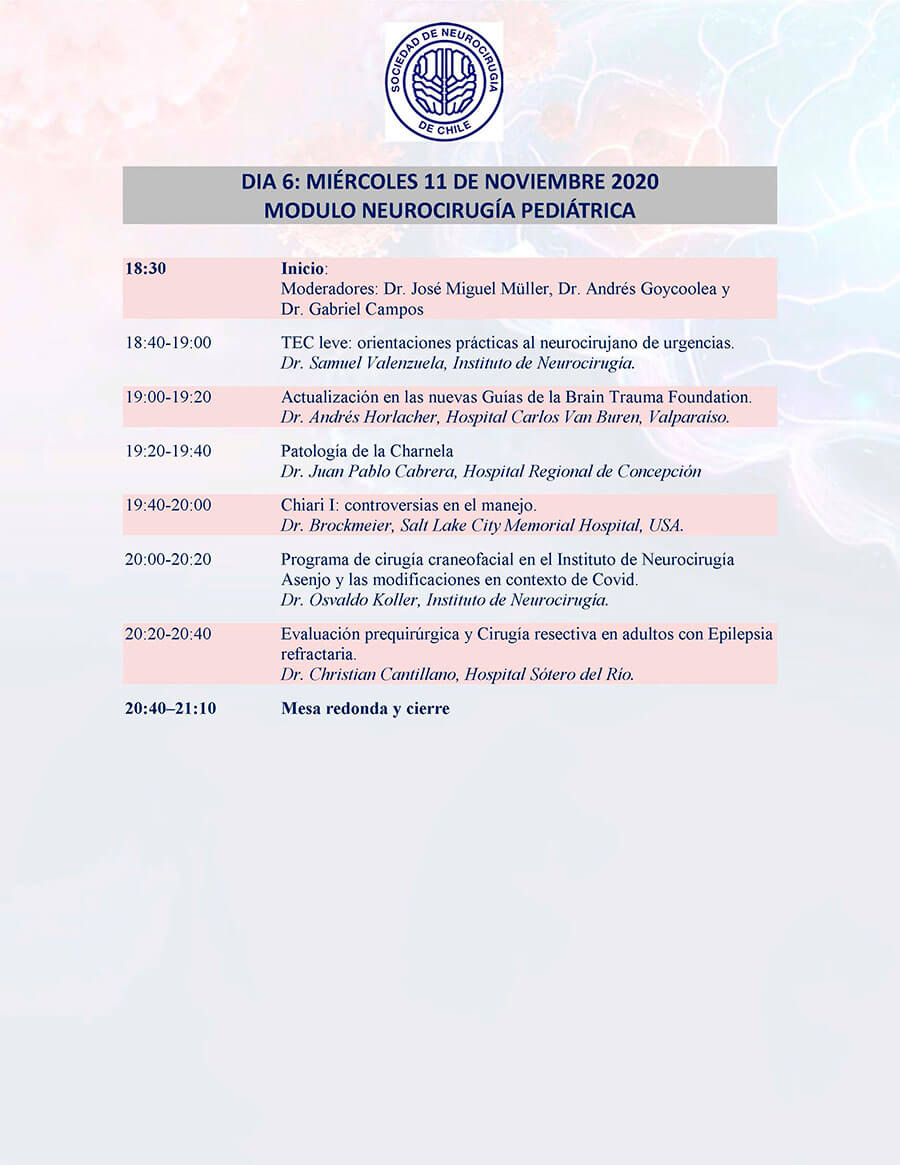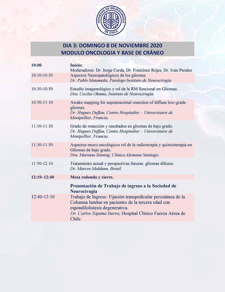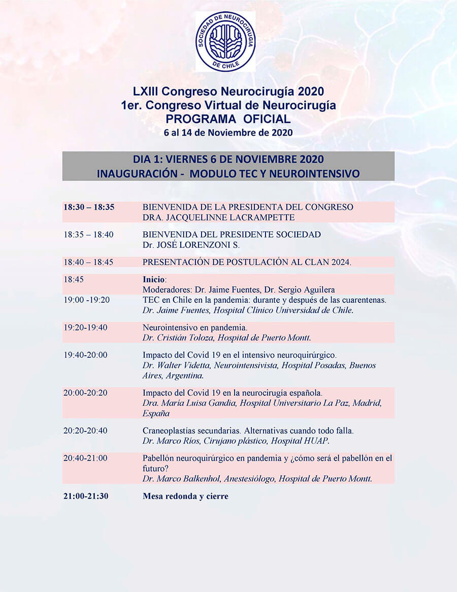 *Curso para Médicos Generales “Lo que todo médico debe saber”: El curso se ha programado a partir del sábado 7 de noviembre desde las 10.00 am. y estará disponible durante la semana completa, al término del Congreso, se realizará la evaluación y la certificación se entregará con horas académicas. Informaciones en: sociedad@neurocirugia.cl – Inscripciones en: https://www.neurocirugiacongreso.cl/web/
