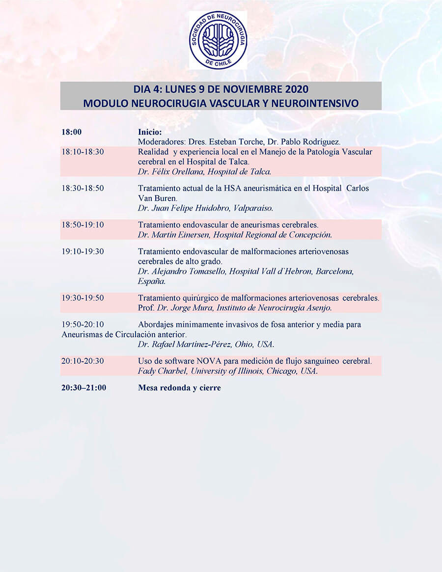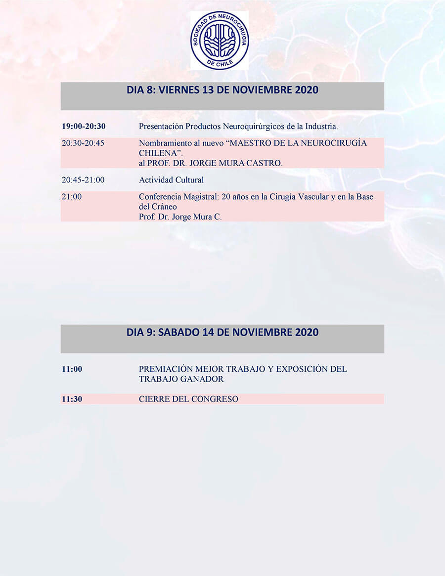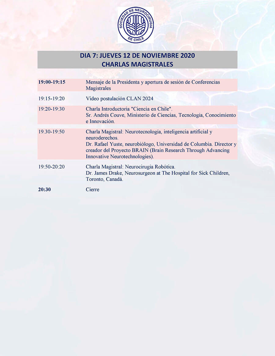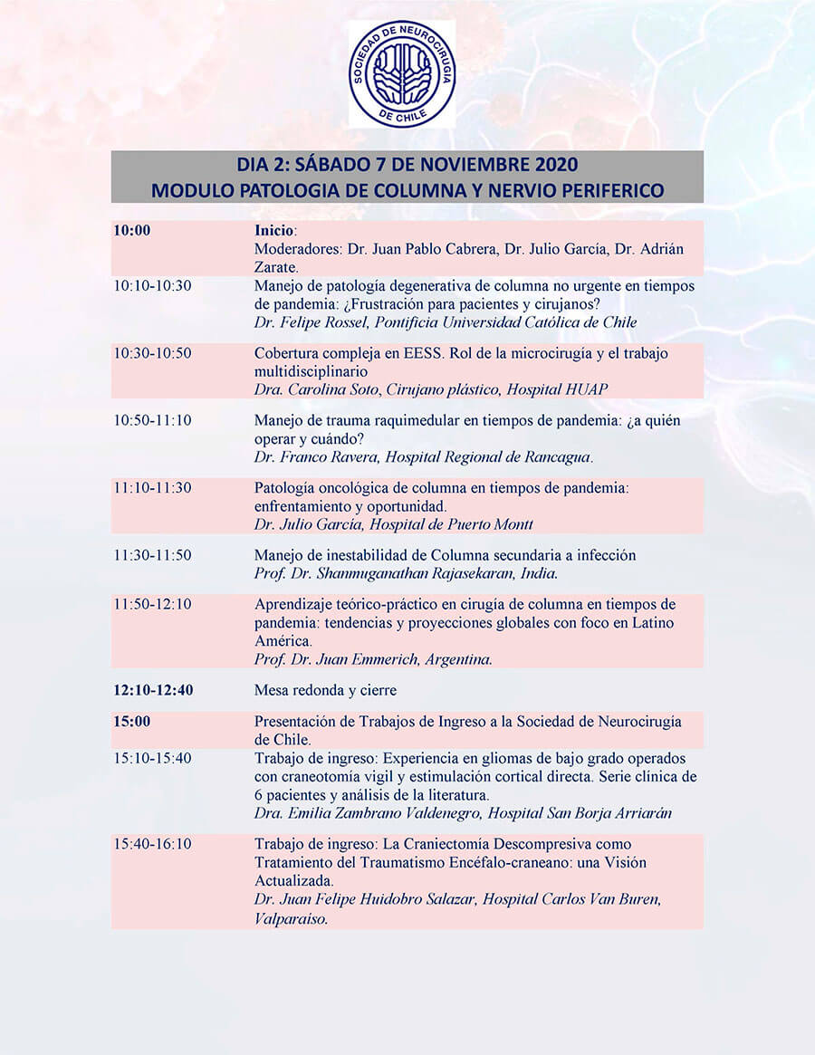 *Curso para Médicos Generales “Lo que todo médico debe saber”: El curso se ha programado a partir del sábado 7 de noviembre desde las 10.00 am. y estará disponible durante la semana completa, al término del Congreso, se realizará la evaluación y la certificación se entregará con horas académicas. Informaciones en: sociedad@neurocirugia.cl – Inscripciones en: https://www.neurocirugiacongreso.cl/web/