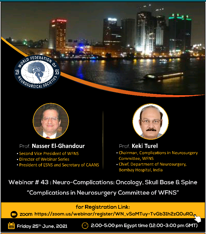 Dear Doctors & Professors, On behalf of Prof Nasser El-Ghandour, Second Vice President of the World Federation of Neurosurgical Societies (WFNS), it gives me great pleasure to invite you to participate in WFNS Event: Webinar # 43, which takes place next Friday 25th June 2021, 2-5 pm Egypt Time (12-3 pm GMT). Title: "Complications in Neurosurgery" |