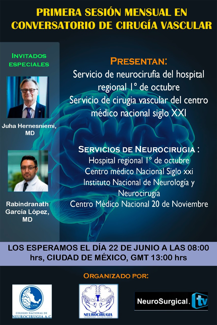 Evento: CURSO ON LINE CIRUGIA CEREBROVASCULAR. Microcirugía de Aneurismas Cerebrales Fecha: Sesión I – Lunes 14 de Junio Sesión II – Lunes 28 de junio, Jueves 1 de julio Sesión III – Lunes 12 de julio Sesión IV – Lunes 26 de Julio, Jueves 29 de Julio Sesión V – Lunes 9 de agosto Sesión |