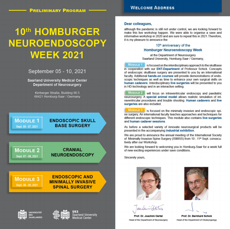 ● Module 1: Focused on the approach to the skullbase in cooperation with our ENT-Department of Professor Shick, Hands on Courses ● Module 2: Intraventricular Endoscopy and Paediatric neurosurgery ● An initiative by a group of distinguished Endoscopic Sinus and Skull Base Surgeons ● Module 3: Minimaly invasive and endoscopic Spine Surgery ● Selected variety innovate |