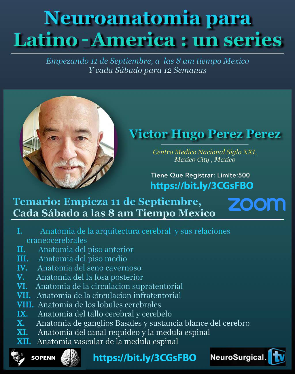 Series de Neuroanatomía con Victor Hugo Perez Perez MD, cada Sábado para 12 Sábados, empezando 11 Septiembre, 2021 Empieza a las 8 am tiempo Mexico, SABADO, 11 Septiember 2021. Reciba un "Certificado de Asistencia". Tiene que REGISTRAR AQUÍ: Hay límite de 500 Panelistas. https://bit.ly/3CGsFBO |
