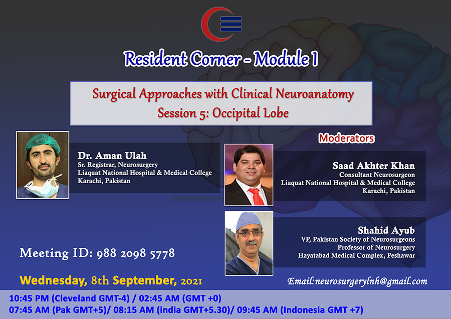 CLINICAL NEUROANATOMY With Surgical Approaches "Occipital Lobe" Wednesday, 8th September 2021 10.45 PM (USA GMT -4) 07.45 AM (Pakistan GMT +5) 08.15 AM (India GMT +5.30) 09:45 AM (Indonesia GMT +7) Zoom Link https://zoom.us/j/98820985778 Meeting ID: 988 2098 5778 YouTube Link https://youtu.be/YFHkYuaaoOk |