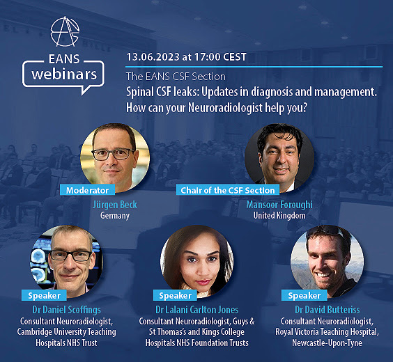 We are glad to invite you to the EANS webinar hosted by our CSF Section entitled: Spinal CSF leaks: Updates in diagnosis and management. How can your Neuroradiologist help you? The invited speakers are Dr Daniel Scoffings, Dr Lalani Carlton Jones and Dr David Butteriss. The discussion will be moderated by Jürgen Beck and Mansoor