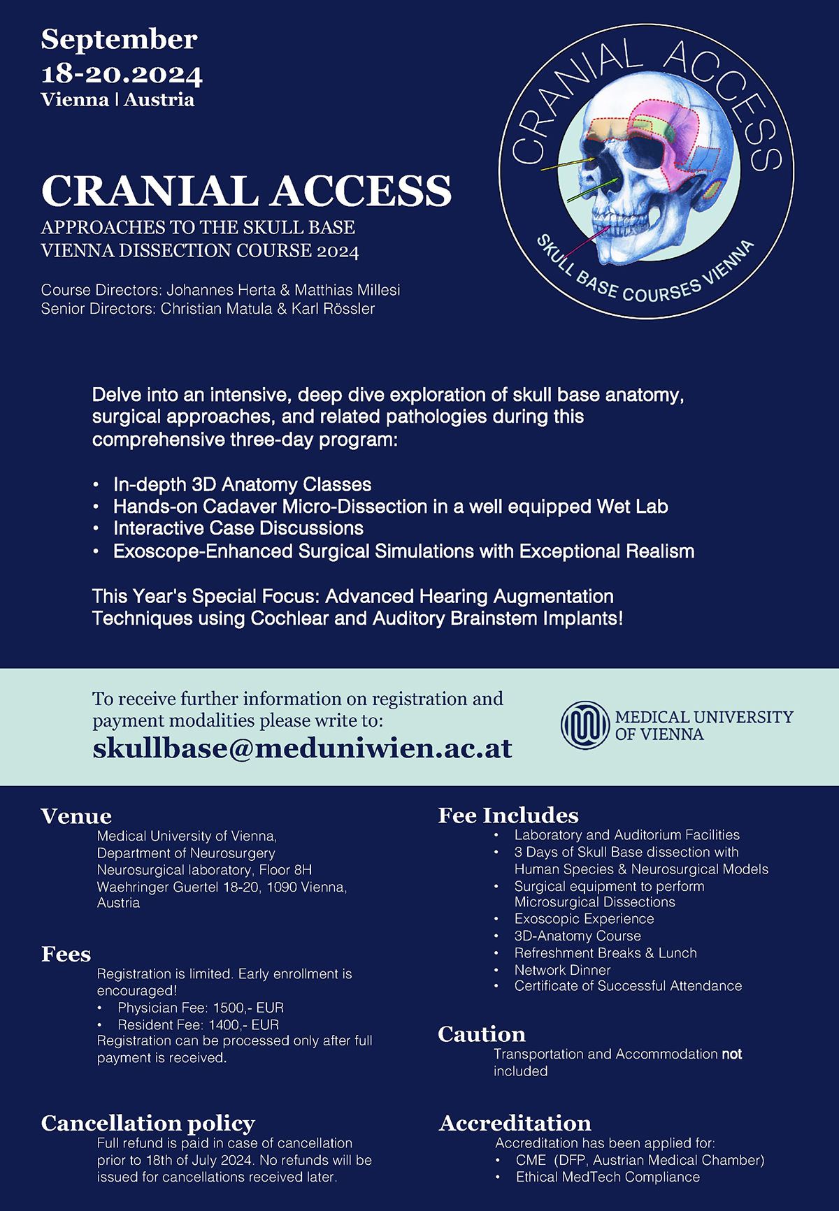 Dear Colleagues! We are glad to invite you to our skull base course “Cranial Access” which will take place from September 18th to 20th in Vienna (Austria). Cranial Access offers neurosurgeons the opportunity to study the anatomy of the skull base through 3D anatomy lectures and to perform skull base approaches in a well-equipped wet lab over