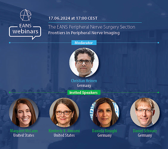 We are glad to invite you to the next webinar hosted by the EANS Peripheral Nerve Surgery Section entitled: Frontiers in Peripheral Nerve Imaging The webinar will feature an outstanding panel of speakers: Margaret McCann (US), Barrow Neurological Institute & Creighton University School of Medicine Kimberly K. Amrami (US), Professor of Radiology, Consultant in Radiology