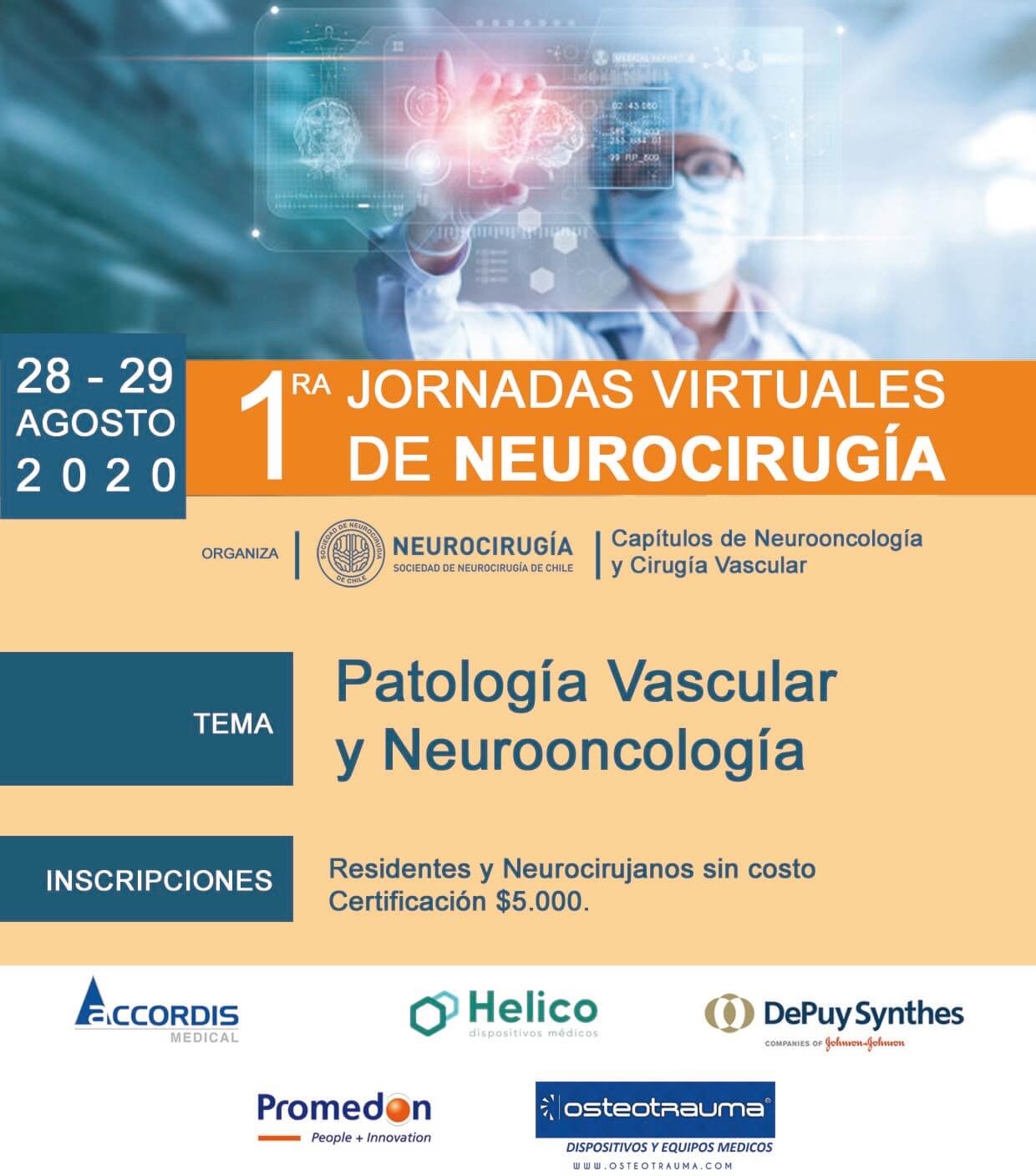 Los días 28 y 29 de agosto se realizarán, vía digital, las 1ª Jornadas Virtuales de Neurocirugía. Las inscripciones se encuentran abiertas y el programa habilitado en el micrisitio del encuentro.