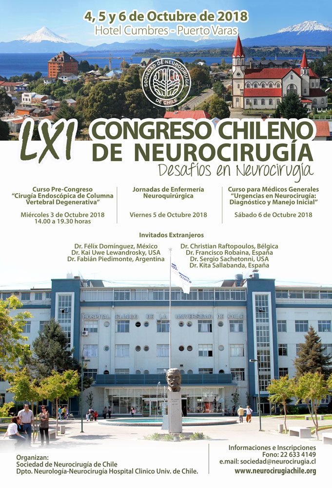 En los días 4, 5 y 6 de octubre del 2018 se realizará el próximo congreso anual de la Sociedad de Neurocirugía de Chile. El servicio de neurocirugía del Hospital Clínico de la Universidad de Chile será el organizador y su temática se orientará en torno a los desafíos para el neurocirujano de hoy.
